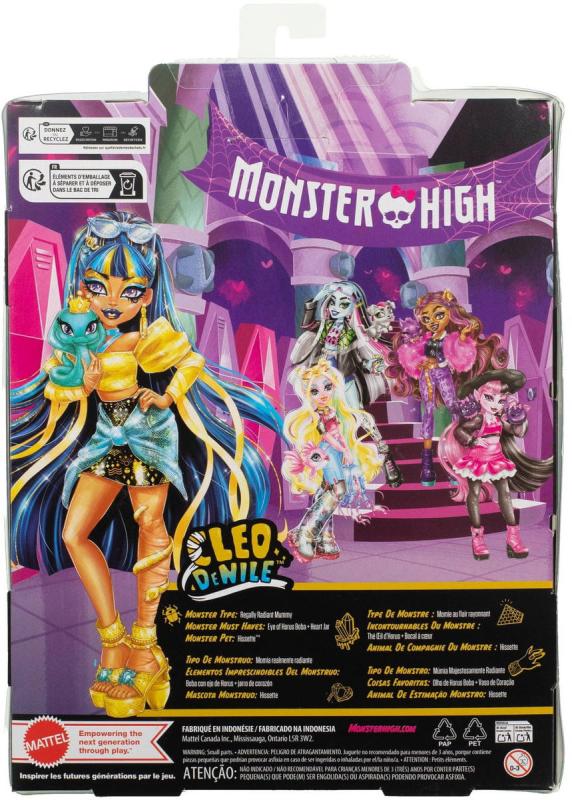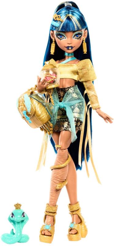 Tato panenka Monster High™ je fakticky mumiózní! Cleo De Nile je od hlavy až k patě oblečená ve svém elegantním stylu. Její strašidelná kobra Hissette je také připravena zapojit se do děsivých dobrodružství! Se svým kloubovým tělem a příšerkovskými doplňky pro vyprávění příběhů je panenka Cleo skvělým dárkem pro děti od 4 let.