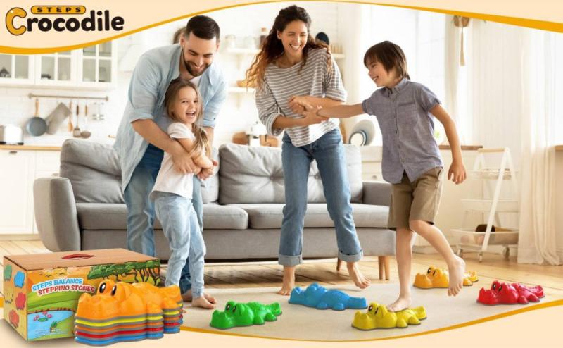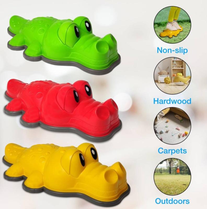 Každý krokodýl má rozměr 41 × 22 × 10 cm a sada obsahuje 6 ks. Unikátní výhodou jsou výměnné oči, které lze nasazovat a měnit, takže si děti mohou vytvářet vlastní výrazy krokodýlů. Kameny tak neslouží jen k tréninku rovnováhy, ale i jako kreativní, hravý prvek podporující fantazii.