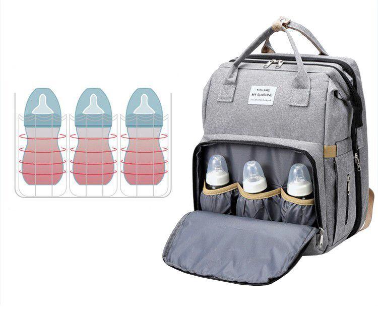 Tento unikátní batoh pro maminky Mommy je praktickou pomůckou pro všechny, kteří se starají o malé děťátko.Batoh se skládá ze dvou velkých přihrádek, přičemž jednu z nich jde pomocí rozepnutí zipu proměnit na pohodlnou přebalovací podložku s vložkou ze síťoviny. Můžete tak kdykoliv a kdekoliv své miminko přebalit. Druhá přihrádka slouží jako klasická kapsa batohu - můžete v ní přenášet plenky, plenkové kalhotky, vlhčené ubrousky, dětskou výživu, láhev s vodou nebo náhradní oblečení. V menší přední kapse na zip jsou 3 přihrádky s termoizolační stélkou, do kterých můžete vložit například dětské lahvičky. Po stranách batohu se nachází ještě dvě přihrádky, vhodné na láhev nebo deštník. V jedné z přihrádek je otvor na zip, který když rozepnete, můžete vytahovat vlhčené kapesníčky přímo z kapsičky. Součástí batohu jsou i dva traky s karabinami, díky kterým batoh jednoduše připevníte na madlo nebo konstrukci kočárku.