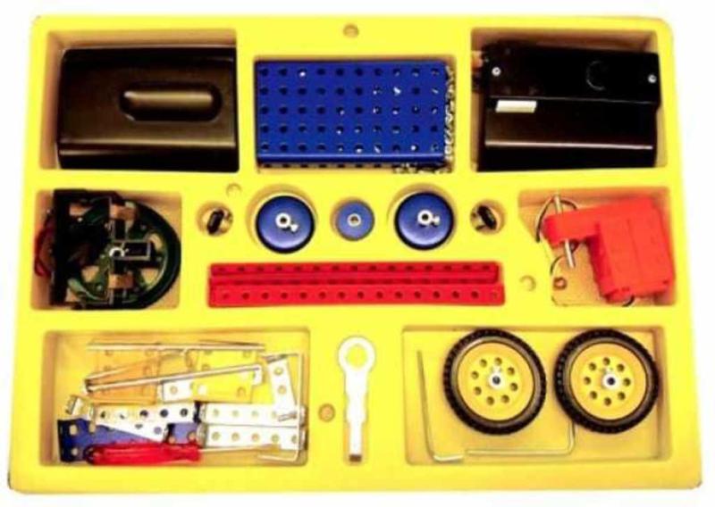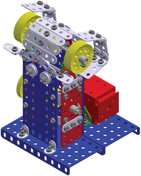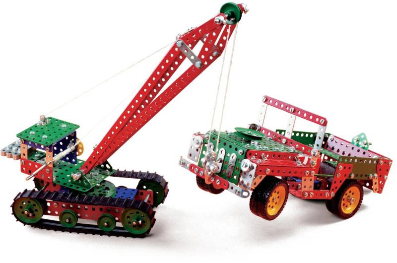 pásů, traktorových kol, ozubených a převodových kol, motorku, dlouhých úhelníků, pásků atd. Ze stavebnice lze také sestavit modely terénních vozidel. Součástí stavebnice je velká návodová knížka s
