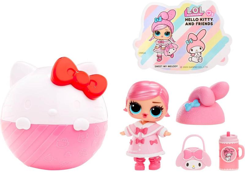 L.O.L.Surprise! se spojilo s ikonickou Hello Kitty. V obalu ve tvaru kočičky s červenou mašlí najdeš jednu panenku inspirovanou Hello Kitty nebo jejími přáteli, a to My Melody, Kuromi, Pompompurin, Cinnamoroll, Tuxedo Sam, Keroppi a Pochacco.