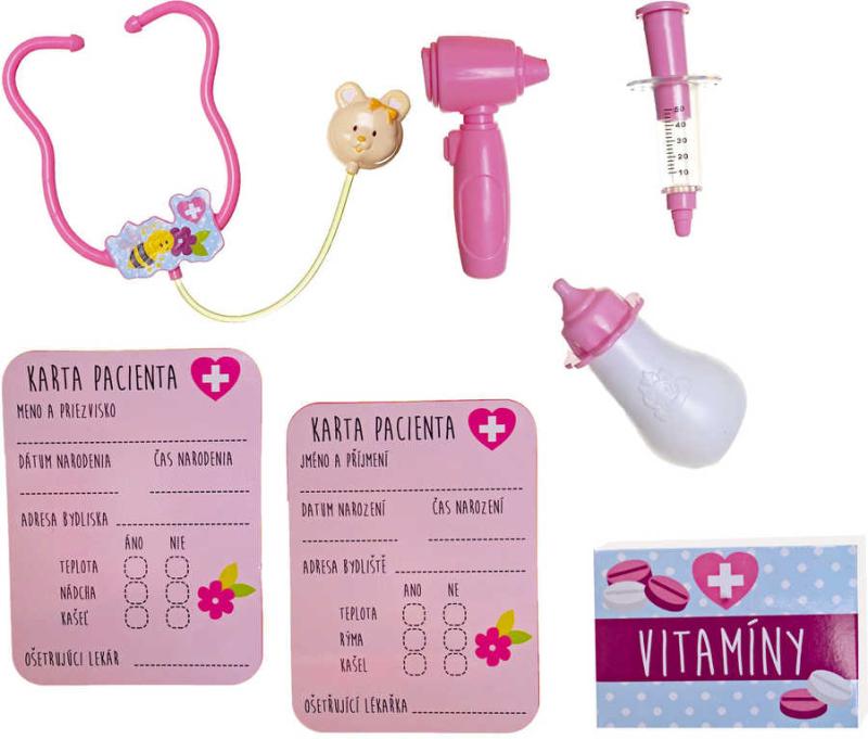 Obsah balení: stetoskop, injekční stříkačka, kukátko do uší, lahvička, krabička s nápisem VITAMÍNY, karta pacienta