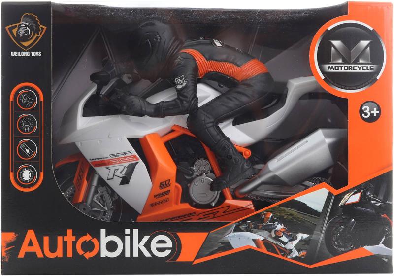 Plastová motorka s jezdcem. Motorka jezdí, svítí a vydává zvuky. Hračka na baterie, se světlem a zvukem.