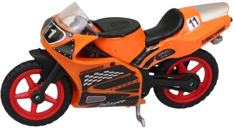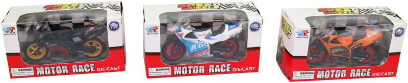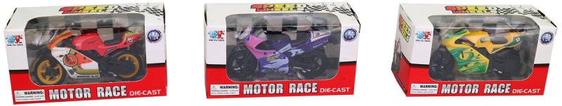 Závodní sportovní motocykl s číslem závodníka, model o velikosti 8,5cm z kovu a plastu. 7 variant provedení.Hračka je vyrobena z kvalitního plastu. Nabízí 7 různých barev a 2 druhy designu. Tato hračka je skvělým doplňkem pro malé kluky, kteří si rádi hrají s autíčky.