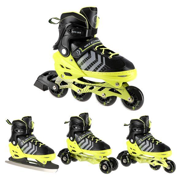 Univerzálne detské korčule s nastaviteľnou veľkosťou a vymeniteľným nožom na ľad pre začiatočníkov aj pokročilých.NILS Extreme NH18192 sú kolieskové korčule 4v1 s vymeniteľným nožom na ľad, ktoré sú určené pre začiatočníkov a stredne pokročilých používateľov. Hliníkový podvozok je osadený mäkkými PU kolieskami s ložiskami ABEC7 pre svižnú jazdu. Vonkajšia topánka je pomocou stlačenia tlačidla nastaviteľná do štyroch veľkostí, toto riešenie umožňuje precízne prispôsobenie veľkosti podľa aktuálnych potrieb alebo sa používa ako "rastúca topánka", ktorá "rastie" spolu s nohou dieťaťa. Na špičke sú ventilačné otvory pre maximálnu priedušnosť. Vnútorná topánka je vyrobená z kombinácie semišu, sieťoviny MESH, EVA a peny s vysokou hustotou. Zapínanie je riešené klasickou trojkombináciou - šnurovanie, remienok na suchý zips a dvojsekčná pracka. Súčasťou balenia je sada skrutiek a podložiek pre prestavbu podvozku do konfigurácie 2+1 a 2+2 a pár nožov na ľad, ktoré sú vyrobené z nehrdzavejúcej ocele s vysokým podielom uhlíka.