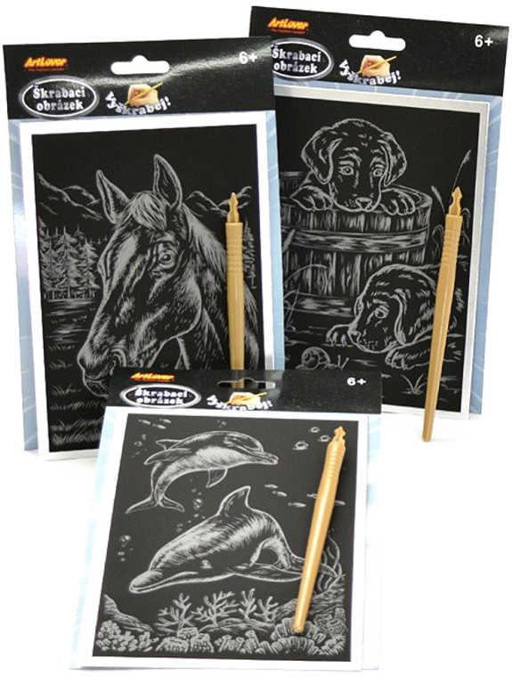 Obrázek škrabací stříbrný zvířátka A5 set s nástrojem různé druhy