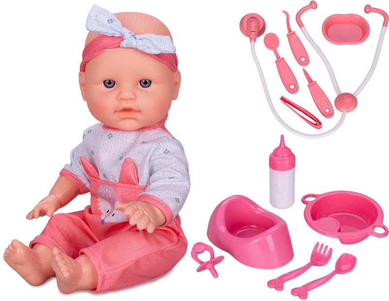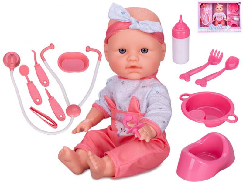 Obsah balení: panenka, kojenecké a lékařské potřeby (nočník, miska, příbory, kojenecká lahvička, fonendoskop, pinzeta a další)