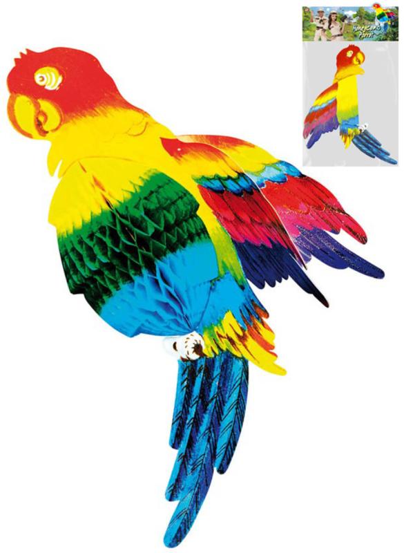 Barevná dekorace papouška má velikost 38 cm a je ideální pro večírky s tématem jižního moře nebo pirátů. Svými pestrobarevnými barvami papoušek vyzařuje skvělou náladu. Břicho papouška je voštinový míč, který lze rozložit. Vneste si do obývacího pokoje atmosféru jižního moře s barevnou dekorací papouška.