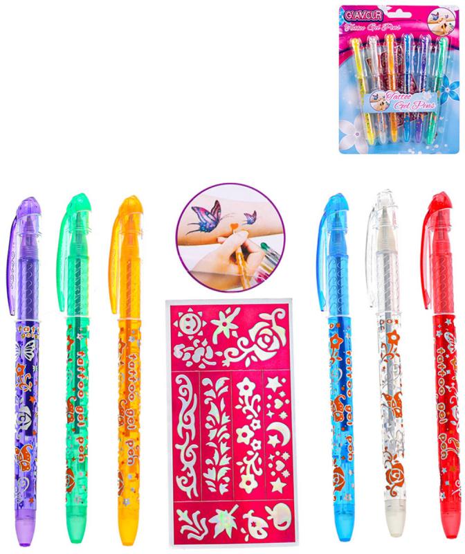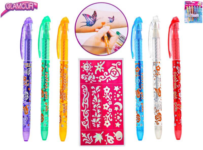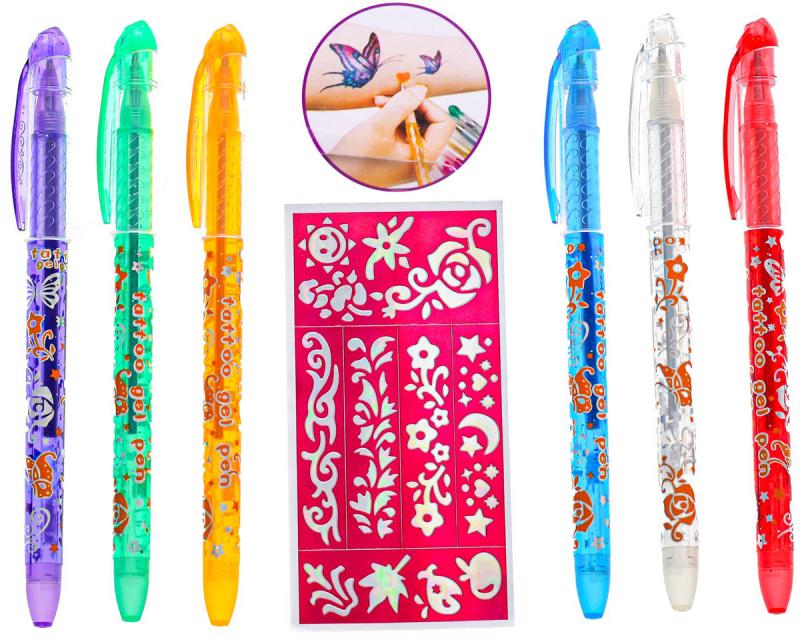 Sada šesti tetovacích gelových per v různých barvách se šablonami. Tetovací gelová pera, díky kterým si můžete jednoduše vytvořit vlastní parádní tetování.Vytvořte si vlastní tetování. Sami si určíte, kam a jaké tetování umístíte a jakou barvu mu dáte! Umístěte šablonu na své tělo a vybarvěte ji. Sada obsahuje list šablon a 6 gelových per v barvách červené, modré, fialové, zelené, oranžové a bílé.