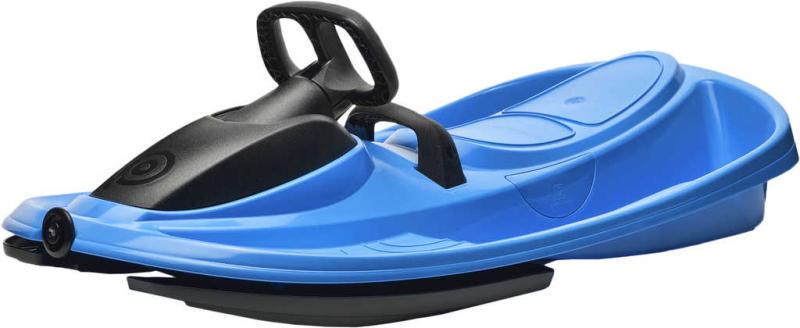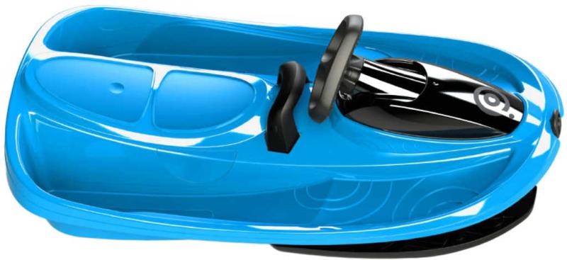 Luxusní a kvalitní plastový řiditelný bob STRATOS dvoumístný, v modrém provedení, pro děti na sníh. Zatáčení pomocí diferenciálu zvyšuje rychlost v zatáčkách, protože každá