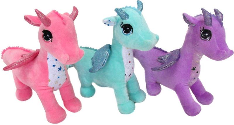 Veselý pohádkový dráček z plyše, barevný drak se třpytivými detaily, s motivem hvězdiček, ve třech barevných variantách, pro všechny malé princezny.