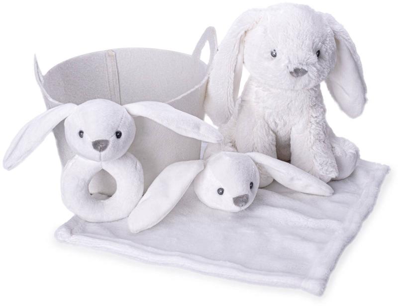 Obsah balení: košík, plyšák zajíc, chrastítko, mazlící dečka