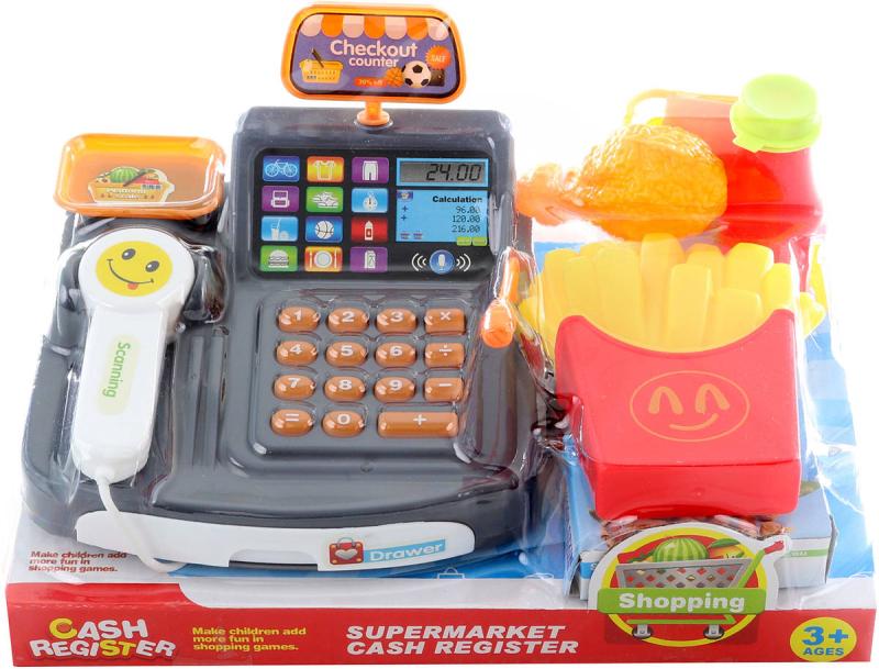 Plastová sada pokladny s doplňky. Napájení na 2 AA baterie (nejsou součástí). Sada obsahuje pokladnu se skenerem, zboží k markování a dětské peníze. Po vložení baterií skenner pípá a pokladna svítí.