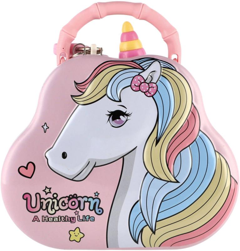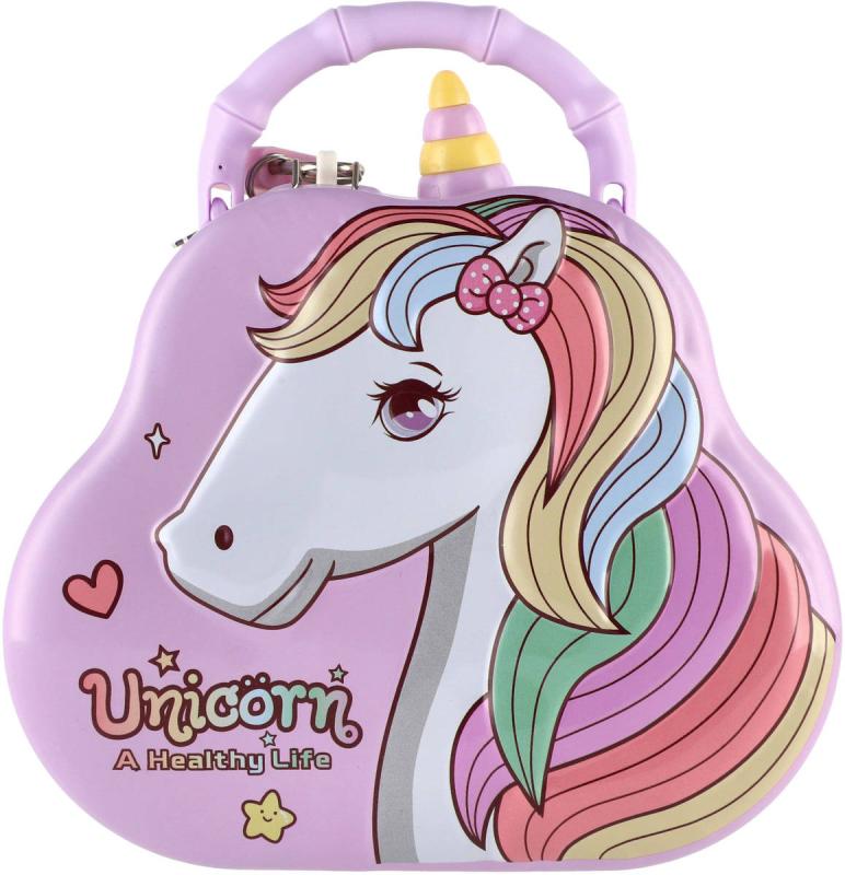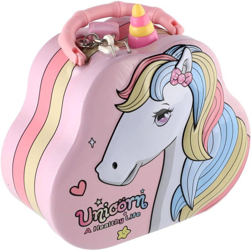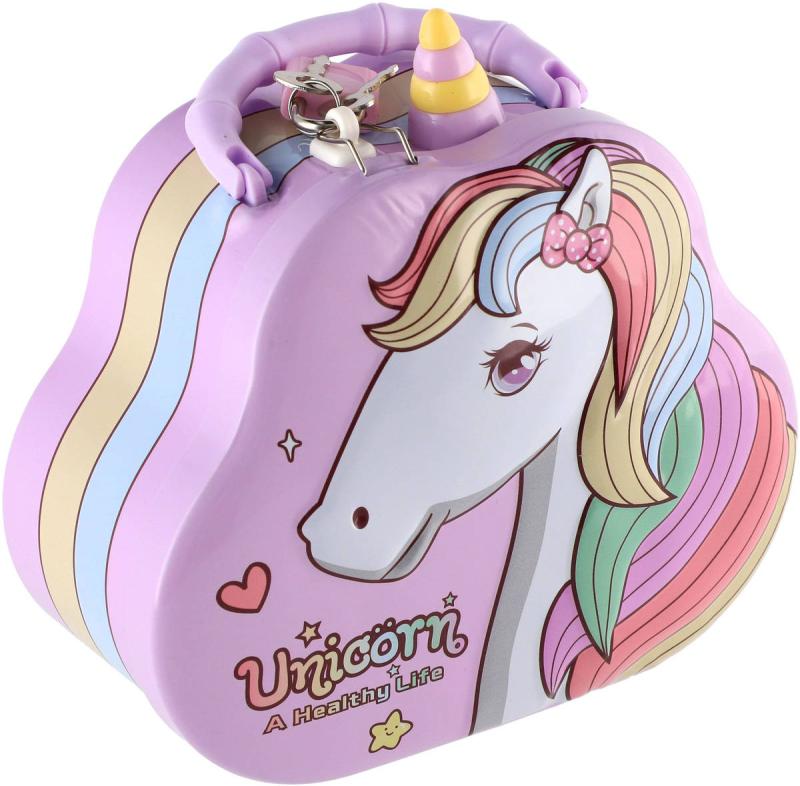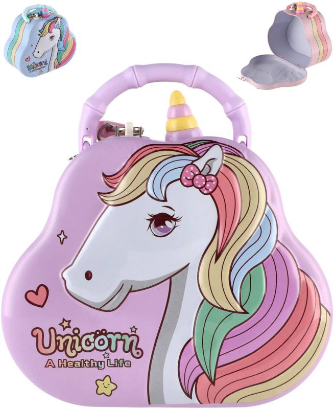 Kovová dětská holčičí pokladnička - kabelka s plastickým 3D motivem "jednorožec", 3 barevné varianty, rozměr 15x14cm, součástí zámek a 2 klíčky.Plechová kasička ve tvaru kabelky s jednorožcem je skvělou pomůckou, jak děti naučit hospodařit se svými penězi, ale i k procvičení počítání! Na vrchní části pokladničky je otvor pro vložení mincí. Pokladna je na zámek, takže jsou ušetřené penízky v bezpečí.