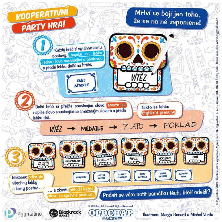 V této kooperativní hře si každý hráč vytáhne z balíčku kartičku s postavou. Vylosovanou postavu tajně napíše dovnitř lebky a tu ihned uzavře. Mezi čelisti lebky napíše (opět tajně) slovo, které s postavou