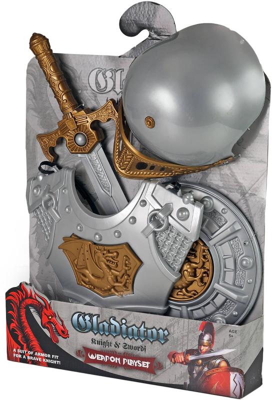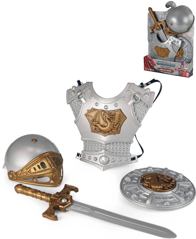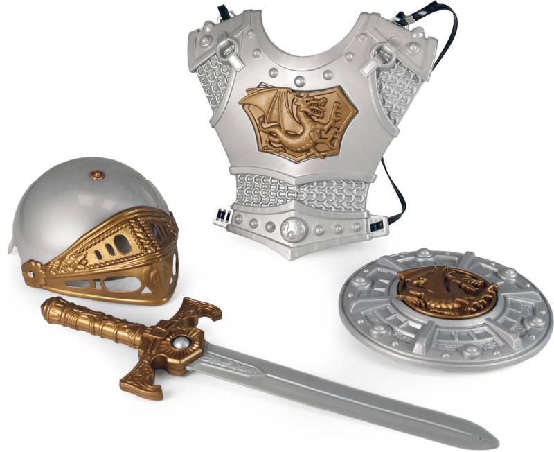 Dětská zdobená plastová rytířská sada. Součástí meč, kulatý štít, brnění a ochranná helma.