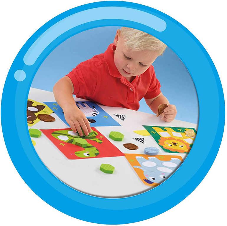 Balení obsahuje: 6 mozaikových karet se zvířátky, 8 pěnových tvarů, 8 plstěných tvarů, 8 tvarů se srstí