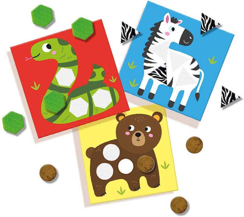 Jejda, těmto 6 zvířátkům chybí části na jejich srsti. Dokážete umístit správné typy srstí na správná místa? Má medvěd měkkou nebo drsnou srst? Mozaikové dílky lze snadno nalepit po odstranění vrchní vrstvy. Hra pomáhá v učení poznávání barev, tvarů a srsti zvířat.