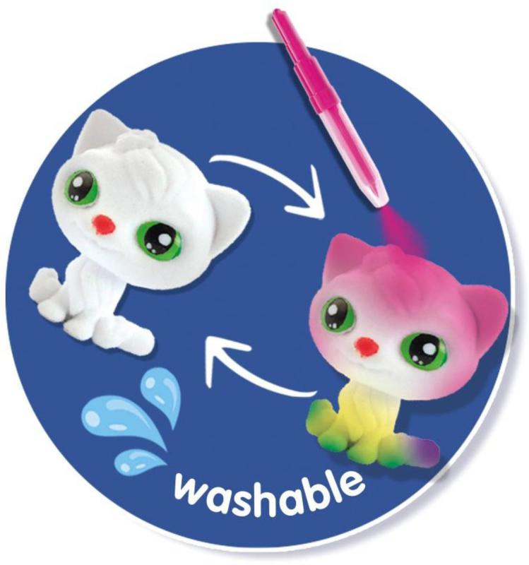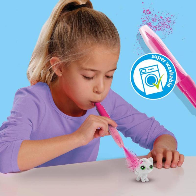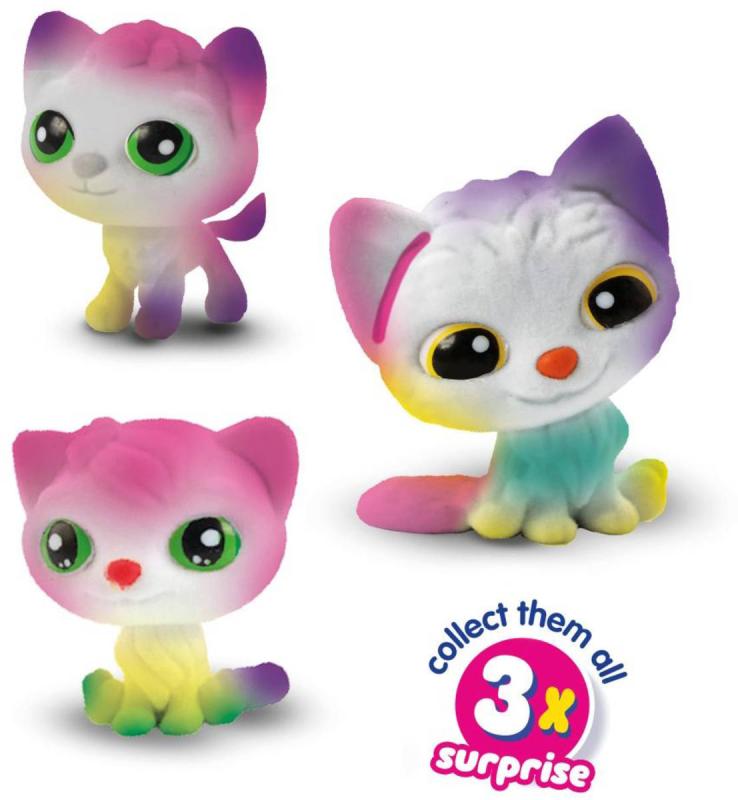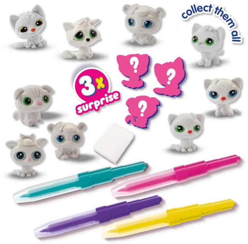 Kreativní sada s foukacími fixy – koťátka 3x překvapení. Tři překvapení čekají na své objevitele. Najděte figurku koťátka s hebkou bílou srstí. Sada obsahuje 4 x barevné foukací fixy s kterými můžete každému koťátku dát veselé barvy, tečky nebo proužky. Hotovo? Omyjte je dočista pod tekoucí vodou a koťátka budou připravena k opětovnému tvoření. Nasbírejte všech 9 koťátek z kolekce.