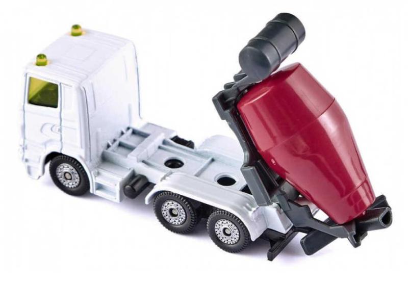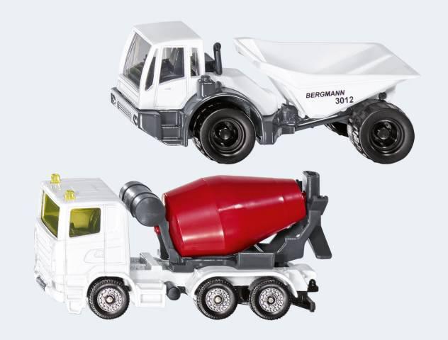 SIKU 1692Sklápěč vykládá zeminu ze své velké korby. Míchačka na beton s velkým otočným bubnem je již ve vypouštěcí poloze. Míchačka s kabinou řidiče a podvozkem vyrobeným z kovu se dokonale hodí pro