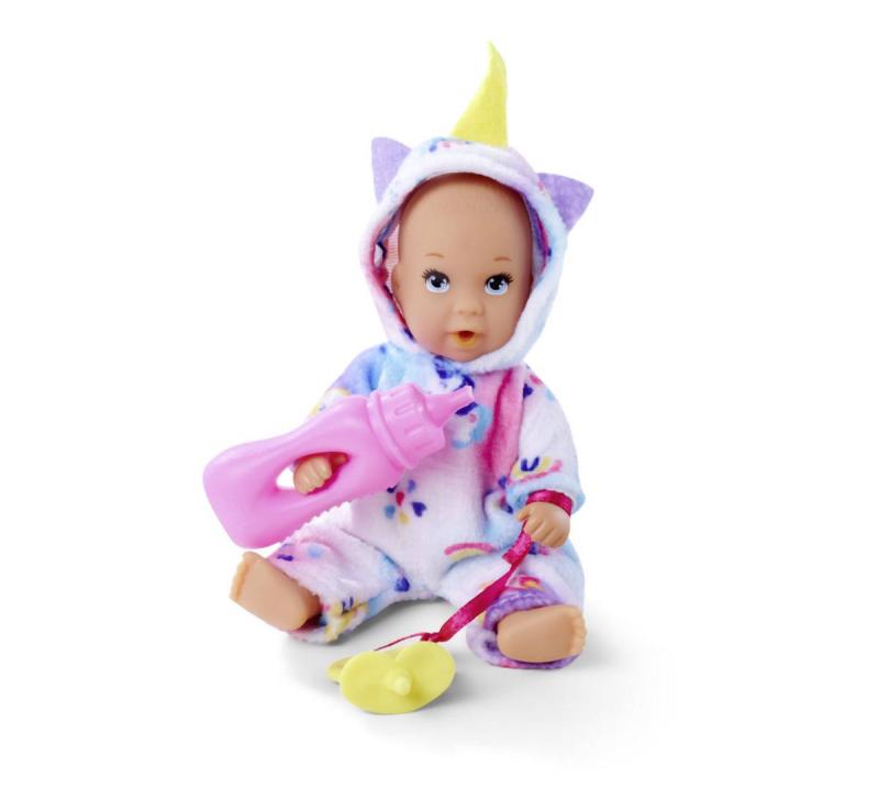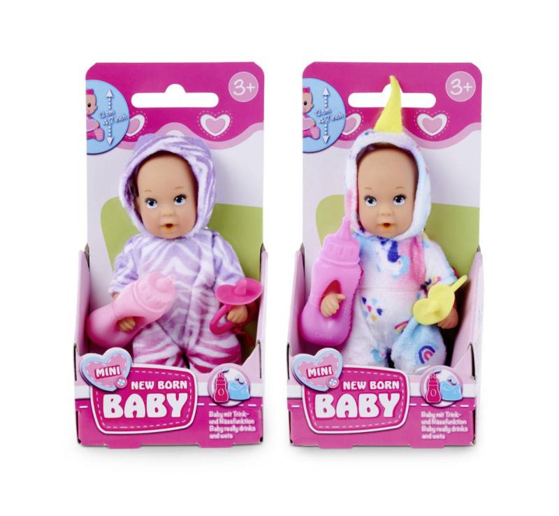 Panenka New Born Baby MINI pije a čůrá. Balení obsahuje lahvičku a dudlík. Pyžamo je ve dvou motivech - jednorožec, džungle.