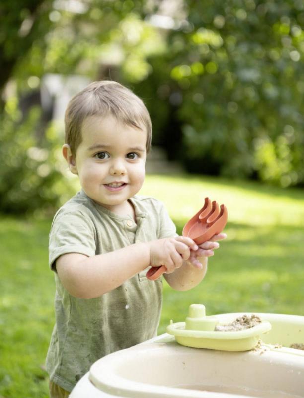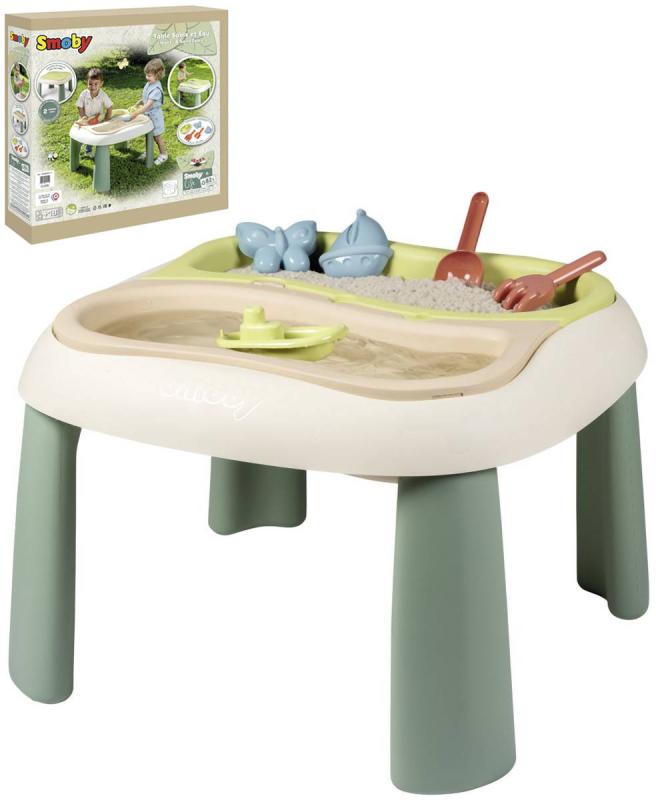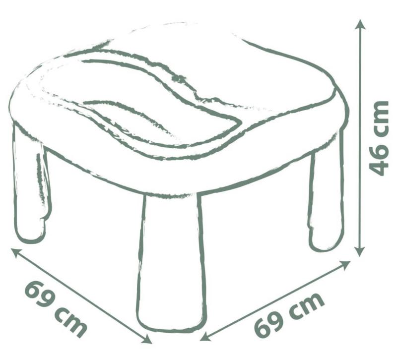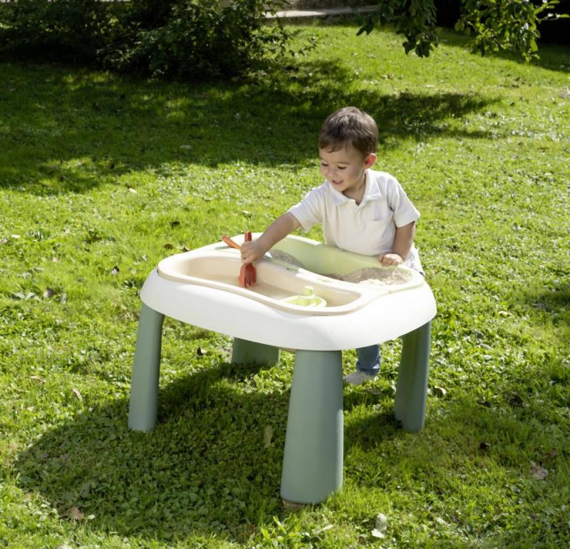 Venkovní stoleček z kvalitního, robustního plastu. Součástí stolu jsou dva vyjímatelné boxy na písek a vodu, lodička, hrabičky, lopatička a 2 formičky na písek. Dodáváno i s ochranným víkem (2 části). Vhodný i do prostor s nedostatkem místa. Uprostřed stolu otvor pro slunečník (není součástí balení). Plastové díly jsou ošetřeny anti-UV, což zajišťuje dobrou odolnost a stálost barev v průběhu času. Tento výrobek obsahuje minimálně 83% recyklovaného materiálu.