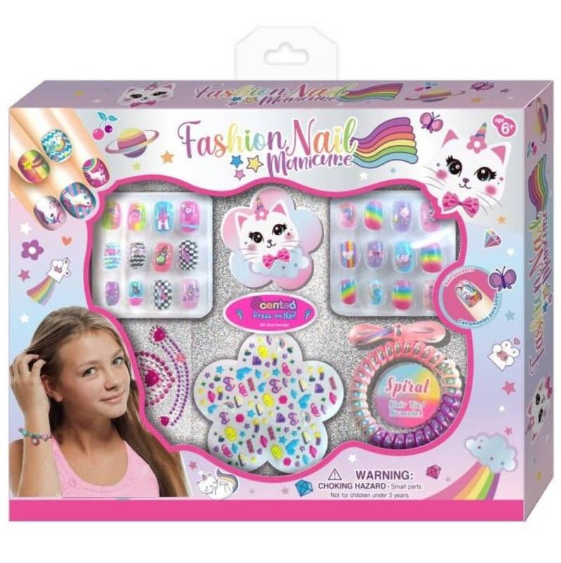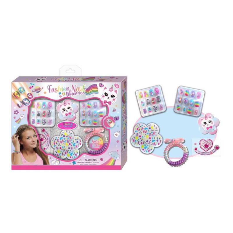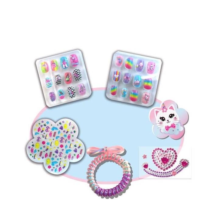 Velká sada s nehtovým studiem. V balení naleznete nalepovací barevné nehty, pilníček, ozdobné kamínky, spirálovou gumičku.