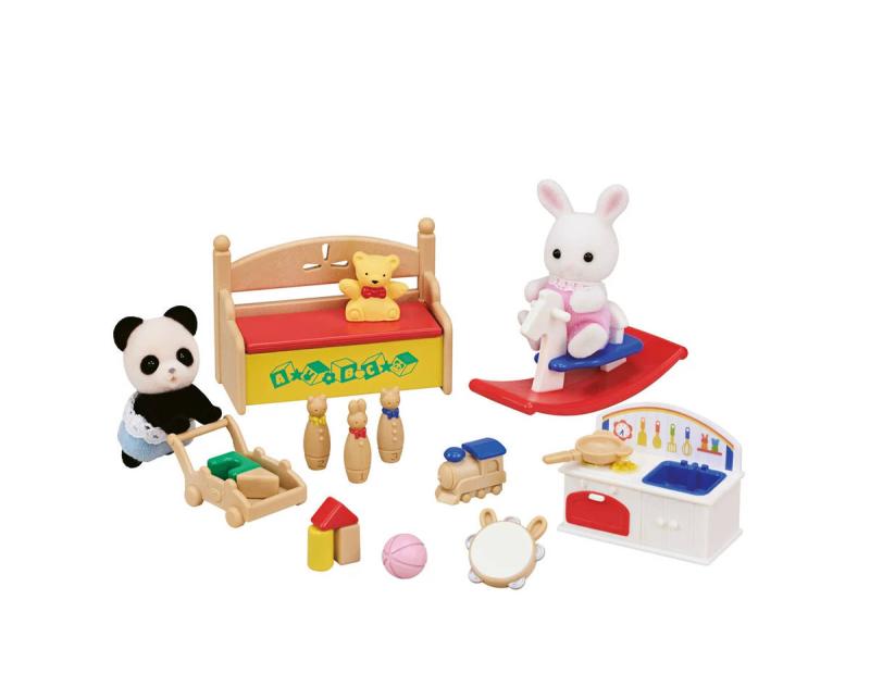Tato barevná sada obsahuje dvě figurky, otevírací bednu na hračky, kuchyňku na hraní, houpacího koně a spoustu dalších hraček na hraní. Hračky Sylvanian Families rozvíjejí představivost a podporují děti k hraní rolí. Hraní s figurkami Sylvanian Families rozvíjí kreativitu a učí emoce prostřednictvím vytváření a vyprávění příběhů na základě každodenních zkušeností a pozorování světa. Vyznačují se nejvyšší kvalitou a výjimečným důrazem na detaily. Figurky Sylvanian Families mají pohyblivou hlavu. Oblečení je vyrobeno tak, aby se dalo opakovaně svlékat a oblékat.