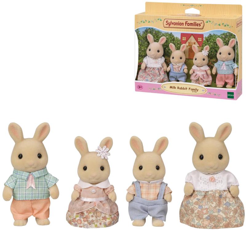 Rodina mléčných králíků. Herní set Sylvanian Families, součástí 4 postavičky - králíci (otec, matka, chlapec, dívky).Rodina se skládá z matky, otce, dívky a chlapce v detailním oblečení. Mléčný králík otec je doktorem Country Clinic. Figurky jsou potažené jemňounkým semišem. Všechny končetiny jsou pohyblivé a hlavička otáčecí. Oblečení je vyrobeno tak, aby se dalo opakovaně svlékat a oblékat. Dobré pro stimulaci imaginativního hraní rolí u dětí.