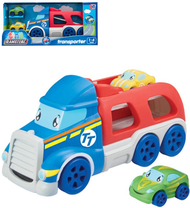Nalož je a odvez je v Tiny Teamsterz Transporter. Součástí jsou 2 volná auta Tiny Teamsterz, jsou měkká a snadno uchopitelná a navržená v jasných, zábavných barvách se zábavnými tvářemi postav. Transportér je otočný a pohyblivé nakládací rampy umožňují snadnou přepravu do horní nebo spodní úrovně, která dohromady pojme až 4 auta. Zaoblená estetika Tiny Teamsterz Transporter s veselou tváří osloví předškolní děti a nadšence do nových aut.