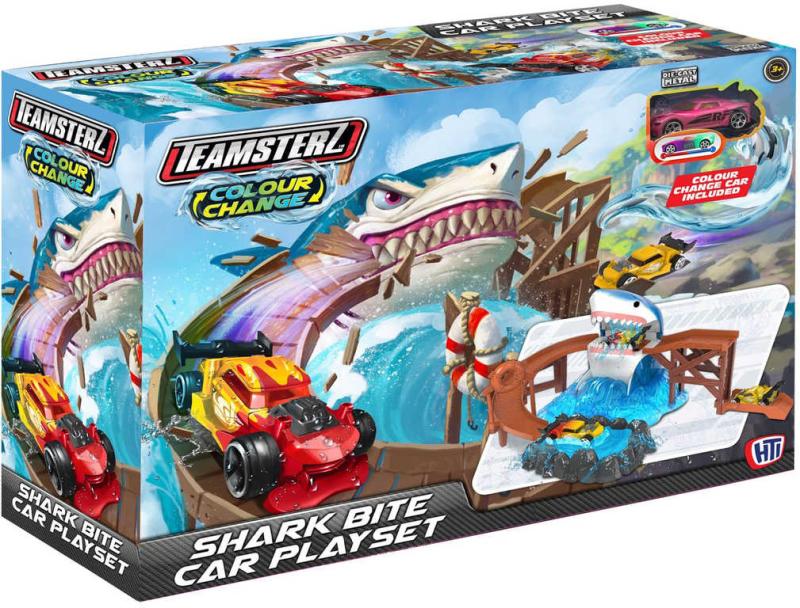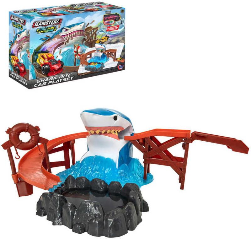 Teamsterz Shark Bite Cars PlaysetSestavitelná plastová hrací sada s akční dráhou se žralokem a kovovým autíčkem, které ve vodě mění barvu. Baleno v krabici.