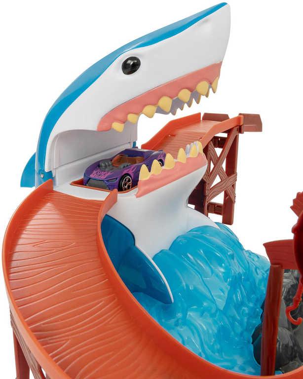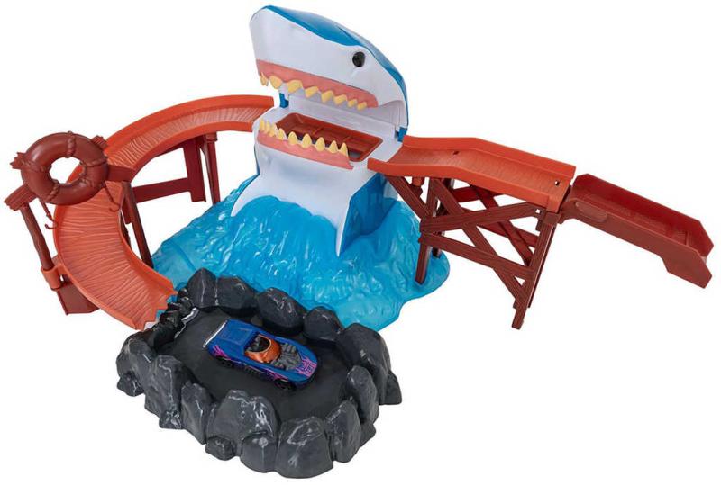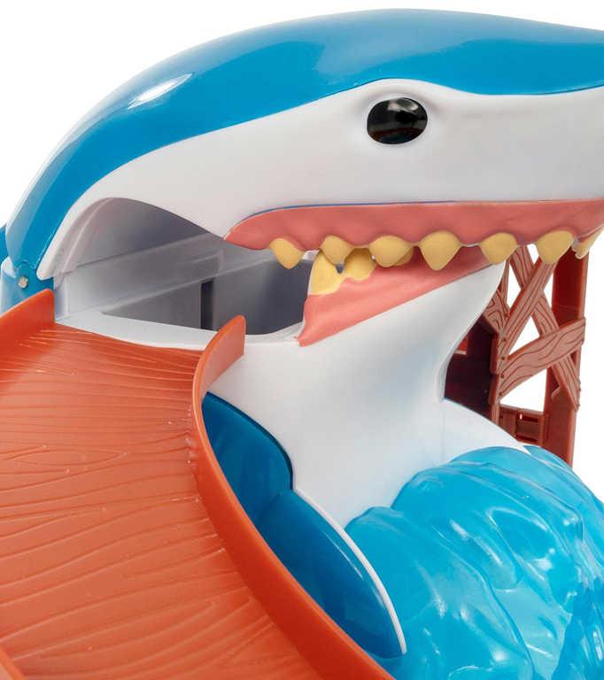 Sestavitelná plastová hrací sada s akční dráhou se žralokem a kovovým autíčkem, které ve vodě mění barvu. Baleno v krabici.