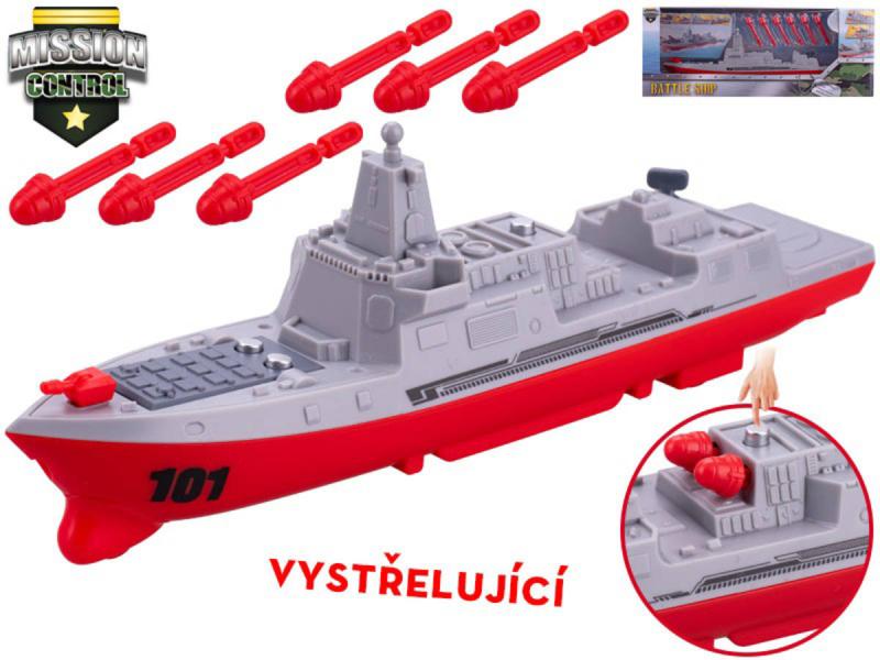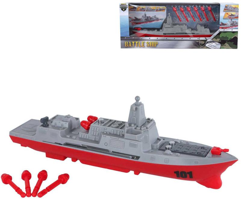 Plastový torpédoborec, bitevní válečná loď o velikosti 24cm, s pohonem na setrvačník s mechanickou funkcí - stříly projektily (6ks součástí).S touto fantastickou hračkou v podobě námořní lodi je akce na moři zaručena! Červeno-šedá válečná loď má střeleckou funkci a šest červených projektilů. Ideální pro vzrušující námořní dobrodružství!