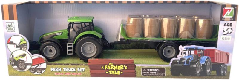 Traktor s přívěsem se senem ve 3 barvách. Velikost 45×9×7,5 cm. Pohon na setrvačník.