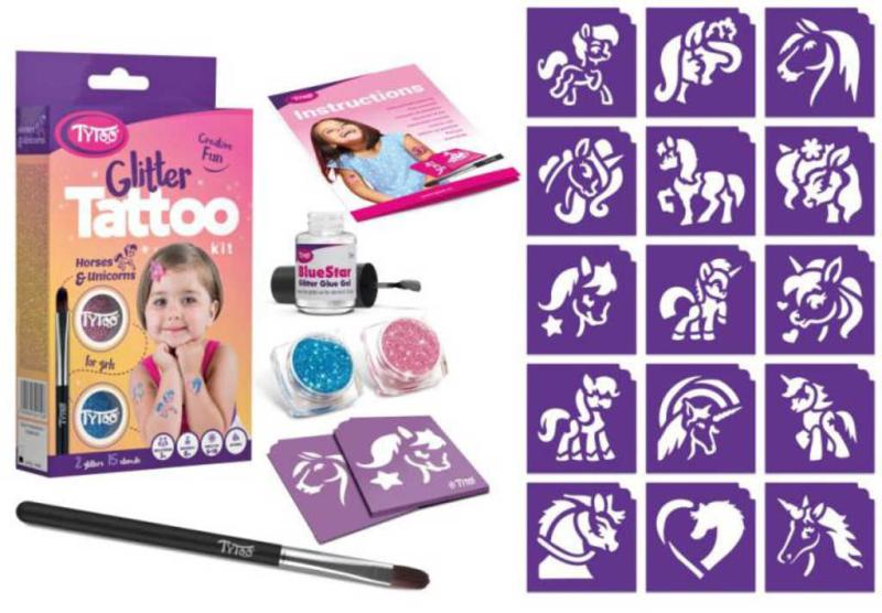 Kreativní dívčí sada TyToo Koníci potěší všechny malé holčičky. Díky ní si mohou snadno vytvořit na kůži třpytivé tetovačky s motivy koníků a jednorožců. Po snadném nanesení aplikace