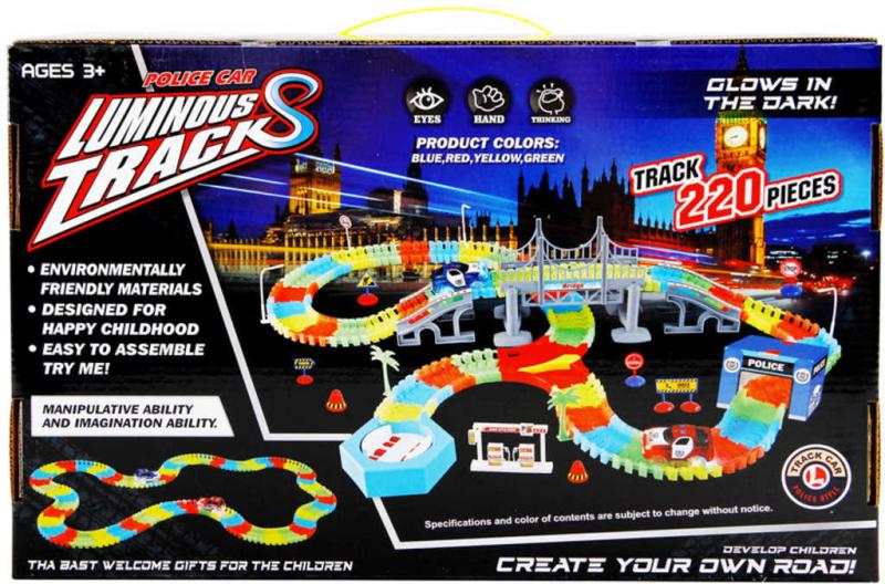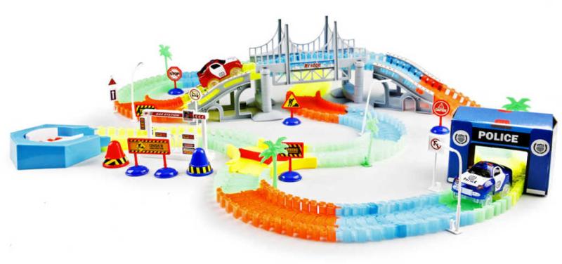 Variabilní dráha svítící ve tmě, která má 220 dílů. Součástí sady je jedno autíčko s LED světlem, přemostění, policejní stanice, benzínová pumpa a jiné doplňky.Provoz této sady je na 2×1,5V AA baterie – nejsou součástí balení.