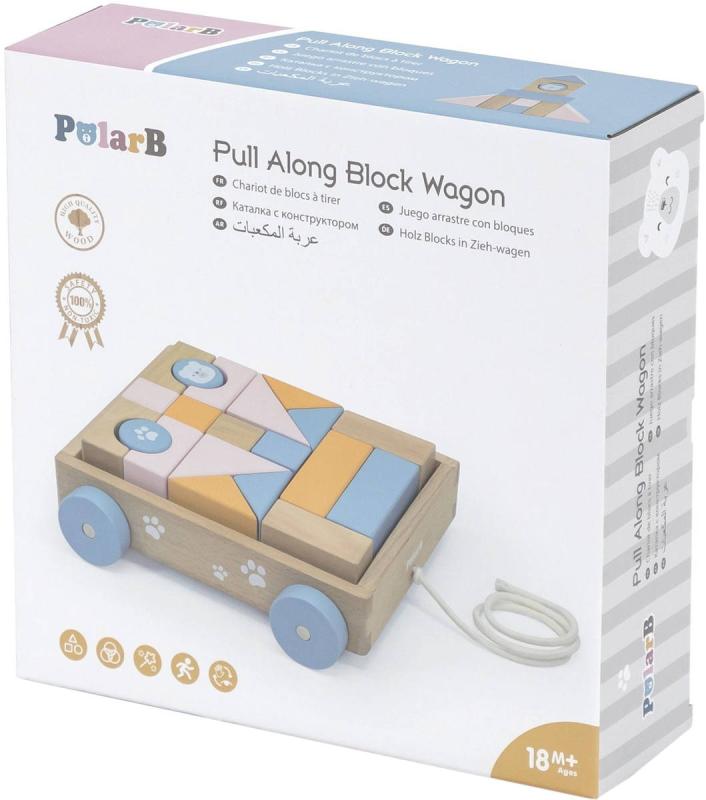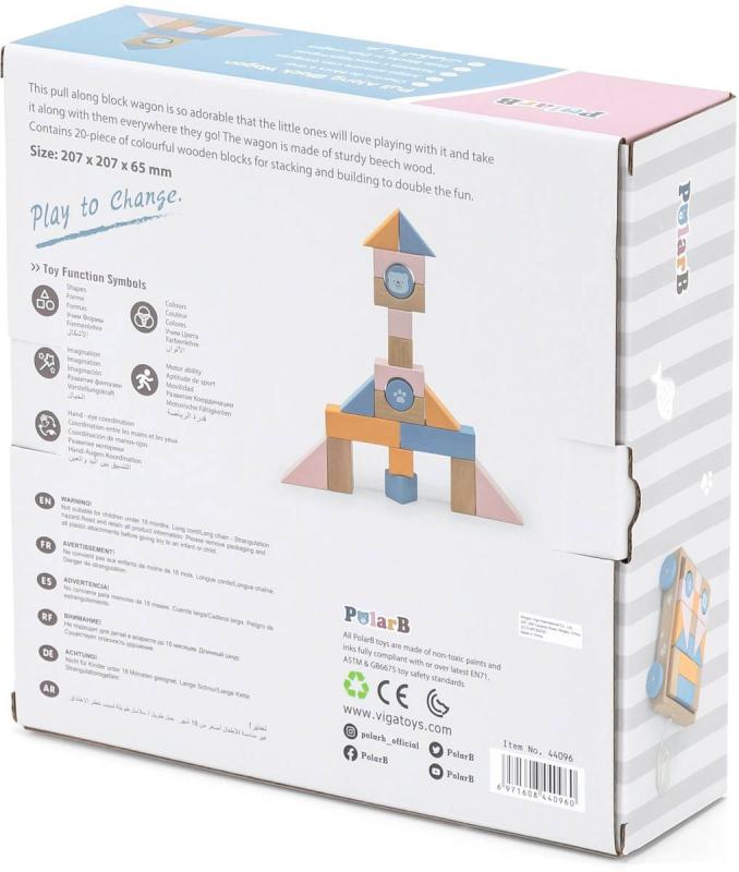 Dřevěná stavebnice pro nejmenší stavitele. Kostky jsou uloženy v tahacím vozíku. Pastelové barvy. Baleno v krabici.Dřevěný vozík na kolech, se šńůrkou, na kterém lze vozit přiložené dřevěné kostky v jemných pastelových barvách, různých tvarů. Dřevěný vozíček s kostkami rozvíjí dětskou fantazii a barevné vnímání. Vozík se šňůrkou je opatřen kolečky. Hraní s kostkami rozvíjí dětskou fantazii a jemnou motoriku. Pokud se z vozíku kostky vyndají, lze jej použít třeba na převážení jiných hraček.