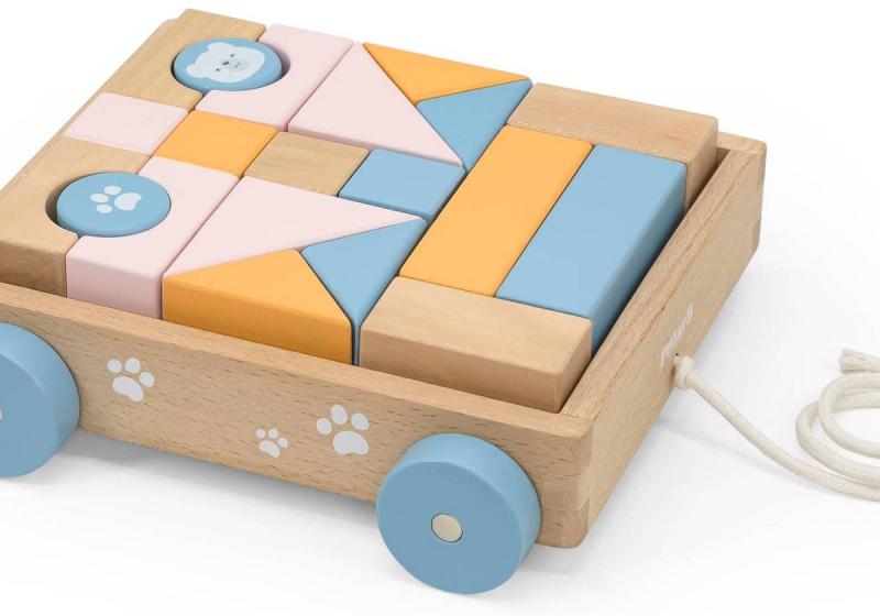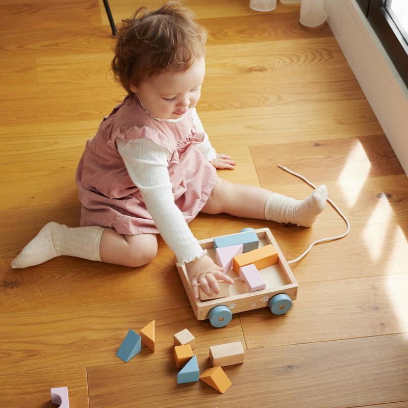 Dřevěný vozík na kolech, se šńůrkou, na kterém lze vozit přiložené dřevěné kostky v jemných pastelových barvách, různých tvarů. Dřevěný vozíček s kostkami rozvíjí dětskou fantazii a barevné vnímání. Vozík se šňůrkou je opatřen kolečky. Hraní s kostkami rozvíjí dětskou fantazii a jemnou motoriku. Pokud se z vozíku kostky vyndají, lze jej použít třeba na převážení jiných hraček.