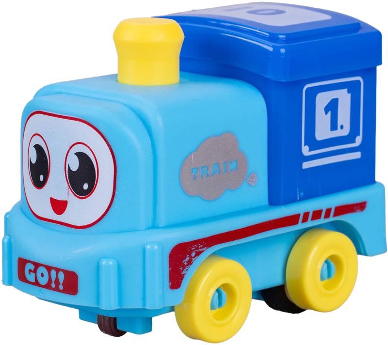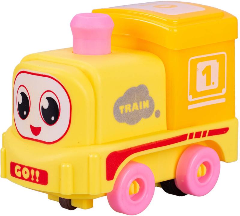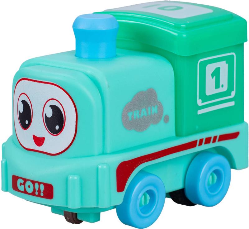 Baby barevný vláček - lehká plastová mašinka, lokomotiva s očima, s pohonem na setrvačník, pro nejmenší děti, pro miminko. Velikost 9cm. 4 barevné varianty.