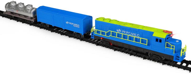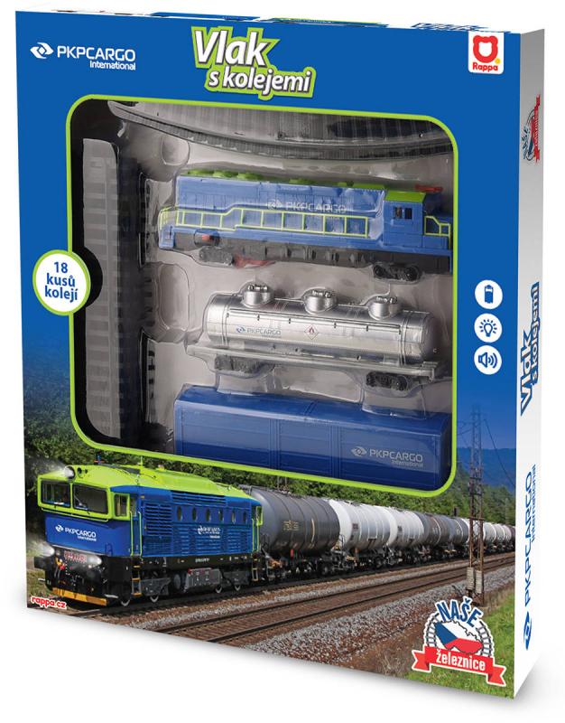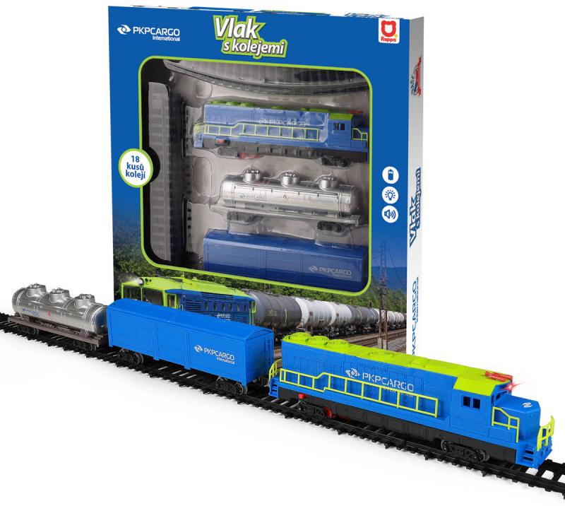 Vlaková plastová souprava s kolejemi. Součástí PKP Cargo lokomotiva + 2 nákladní vagóny + koleje. Hračka na baterie, se světlem a zvukem.Sada z kolekce Naše železnice obsahuje lokomotivu s pohonem, 2 nákladní vagóny, 12 zahnutých a 6 rovných kolejí. Koleje a výhybky je možné dokoupit i samostatně. Lokomotiva jezdí, vydává zvuk a svítí. Vagón měří 20 cm a lokomotiva 23 cm. Lze vytvořit kolejiště až do velikosti 147 x 121 cm (cca 4,4 m). Rozteč kolejí je 2,1 cm. Velikost koleje rovné je 23 cm a zahnuté 25 cm. Tuto novinku lze kombinovat s vlakem České dráhy, Pendolino a RegioJet. Touto originální vlakovou sadou drah určitě potěšíte všechny milovníky a nadšence železnic.