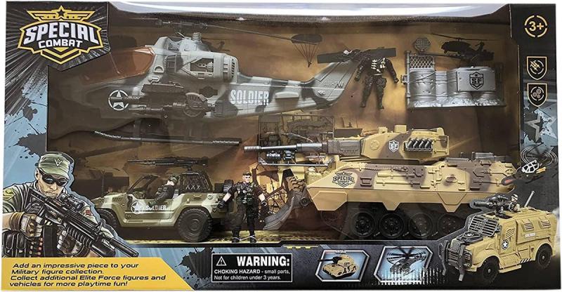 Velká vojenská sada s tankem, bojovým vozidlem a helikoptérou. Součástí jsou figurky vojáků a spousta doplňků.