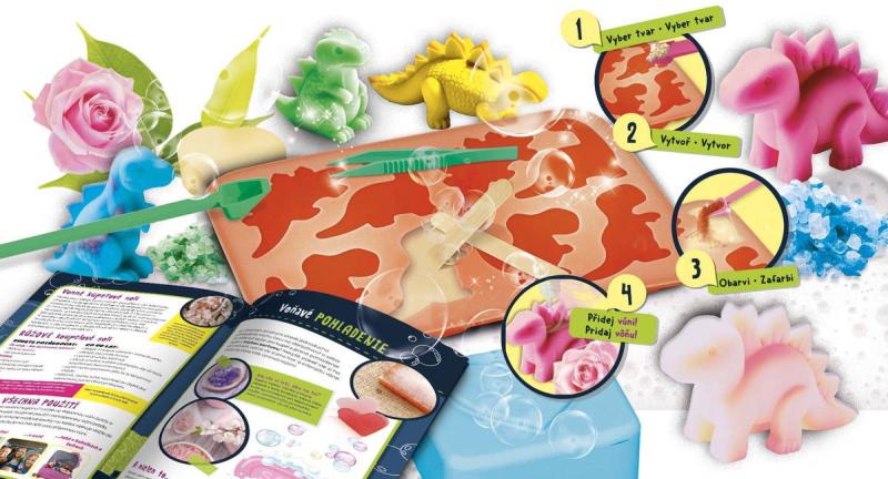 Kreativní sada pro děti, která umožňuje vyrobit vlastní barevná a voňavá mýdla s motivy dinosaurů. Díky přiloženým formičkám a glycerinovým vločkám si děti snadno vytvoří originální mýdla ve tvaru pravěkých zvířátek a zároveň rozvíjejí svou kreativitu a jemnou motoriku.
