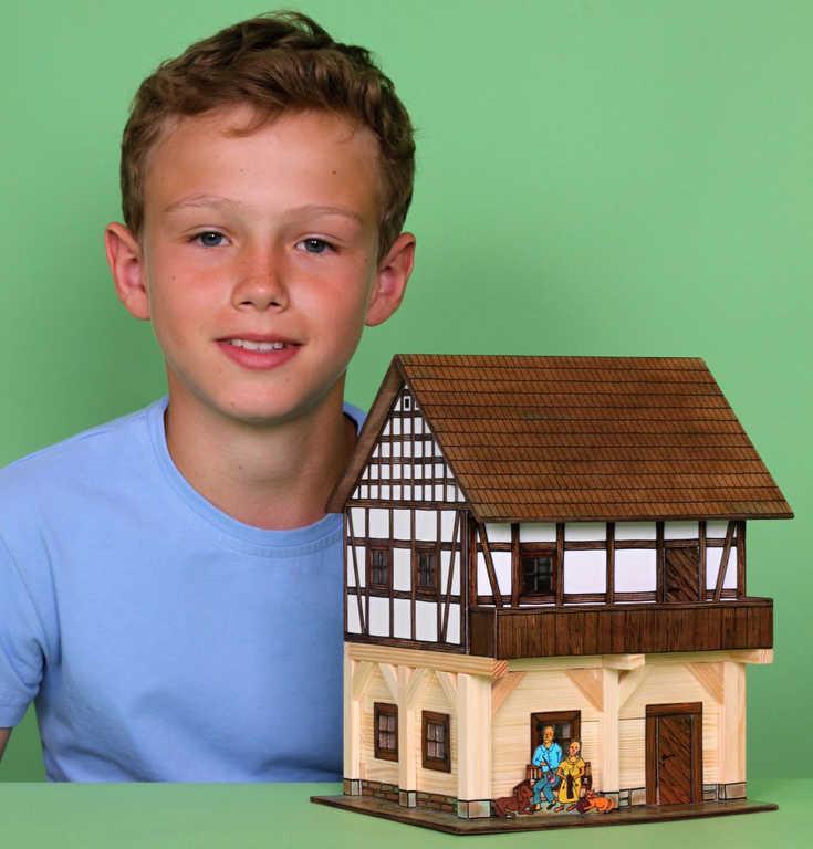 Dřevěná slepovací stavebnice obsahuje dřevěné hranolky daných délek ke stavbě roubených stěn, díly na střechy a štíty, kartonové výseky oken a dveří i předtištěné papírové potisky. Součástí stavebnice je