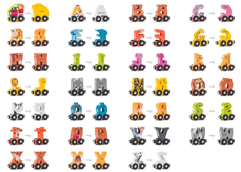 Tento barevný dřevěný vláček s abecedou potěší všechny malé objevitele písmenek i zvířat. Sada obsahuje 27 dílů – lokomotivu a vagonky ve tvaru písmen, které jsou spojeny klasickými magnety. Každé písmeno má podobu zvířátka a na druhé straně jeho anglický název, takže si děti při hře nenápadně osvojují základy angličtiny. Děti si navíc mohou hravě skládat jednotlivá písmena do slov, rozvíjet tak svou kreativitu a učit se číst. Abeceda je krásně barevná, hravá a originální – její jedinečný design pochází od české autorky. Ideální hračka pro rozvoj fantazie, jemné motoriky i jazykových dovedností.