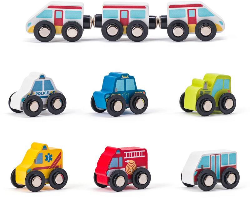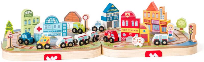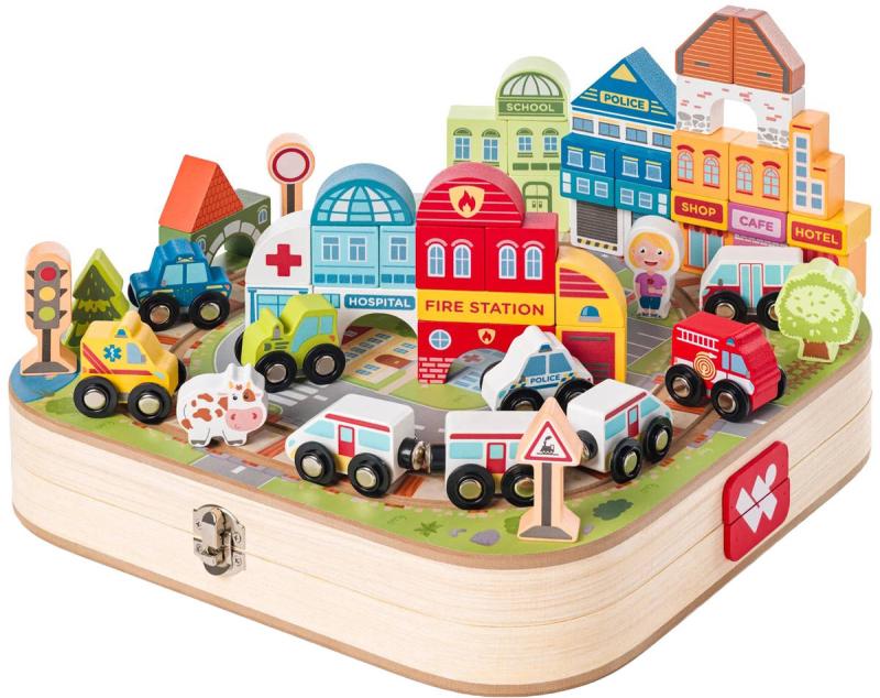 Woody dřevěná vláčkodráha Město v kufříku. Součástí vláček, autíčka, dopravní značení, domečky a další. Celkem 55ks.Otevřete kouzelný svět železnic v dřevěném kufříku! Po jeho rozložení vznikne na obou stranách jeho víka krajina s dráhou ve tvaru osmičky s vyfrézovanými kolejemi. Dřevěný vláček, dřevěná autíčka a kostky pro stavbu domečků tvoří dokonalou herní sadu v jedinečném designu od české výtvarnice.