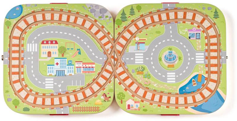 Otevřete kouzelný svět železnic v dřevěném kufříku! Po jeho rozložení vznikne na obou stranách jeho víka krajina s dráhou ve tvaru osmičky s vyfrézovanými kolejemi. Dřevěný vláček, dřevěná autíčka a kostky pro stavbu domečků tvoří dokonalou herní sadu v jedinečném designu od české výtvarnice.