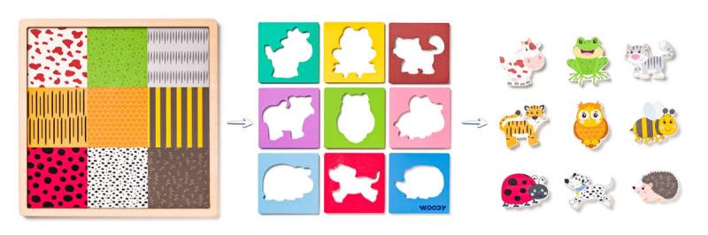 Puzzle ze dřeva se zvířátky, tvary - barva