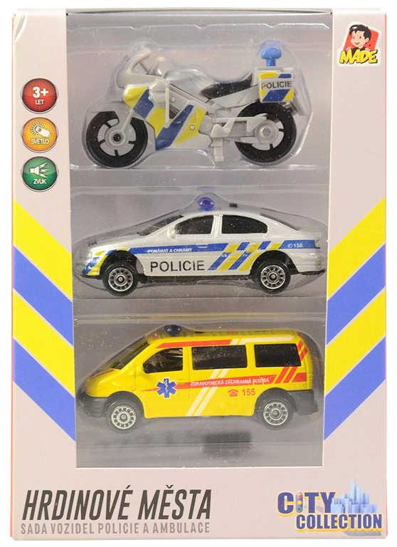 Sada autíček ambulance a policie v českém designu. Znáte z našich silnic. Záchranářská sada policejní motorky (plast), policejního auta a dodávky ambulance (kov a plast) z produktové řady City Collection. Ambulance a auto s houkačkou (světlo a zvuk). Český design. Český box. Hračka na baterie se světlem a zvukem.