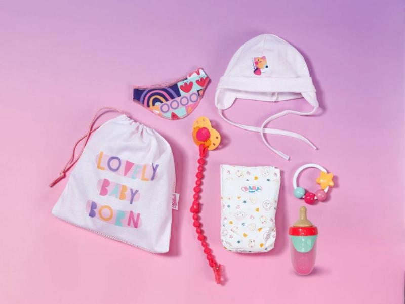 Sada doplňků pro panenky – s lahvičkou, plenou a hracími doplňky. Pečlivě sestavená sada s čepičkou, lahvičkou, plenou, bryndákem a hracími kroužky je ideální pro začátek hraní s panenkou. Vhodná pro panenky vysoké 43 cm.