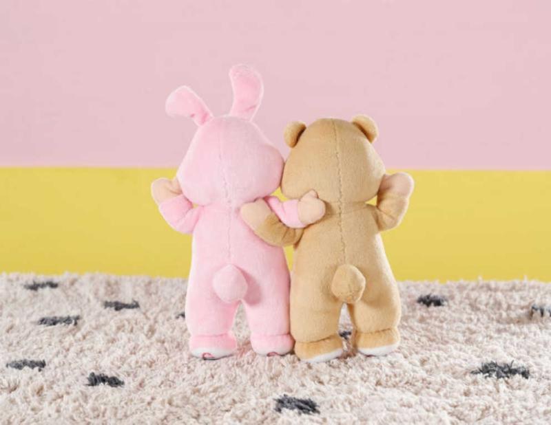 roztomilá ouška a ocásky a objevovat šustění fólie uvnitř. Plyšový kožíšek medvídka a zajíčka zdobí hravé výšivky. Z nich je jasné, že medvídkovi záleží hlavně na medu a včelích kamarádech. Zajíček se